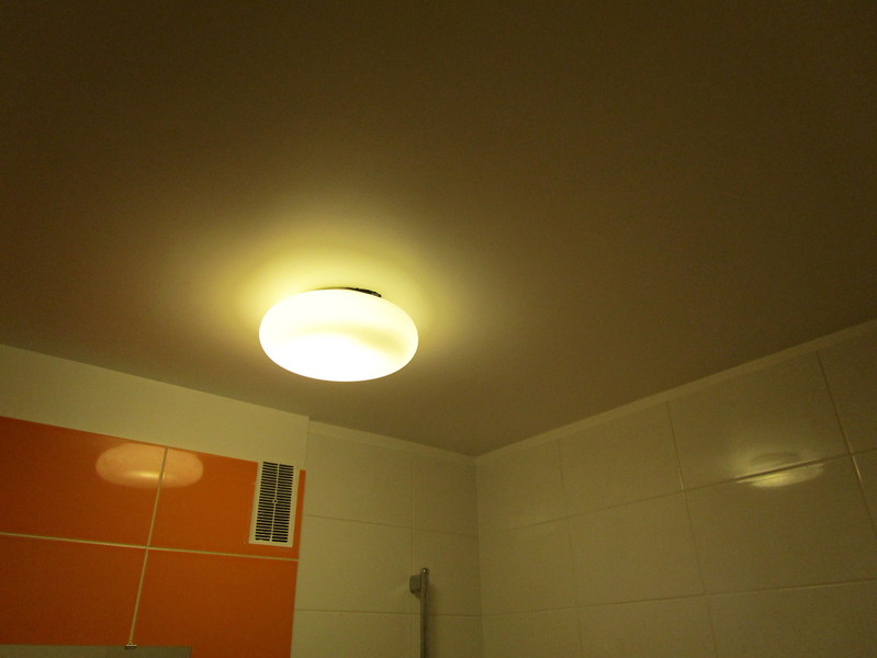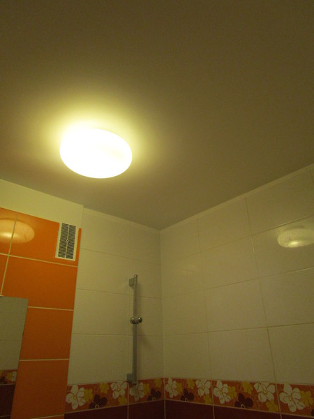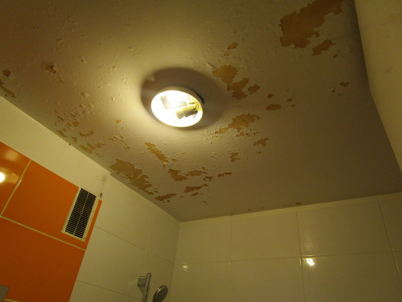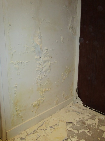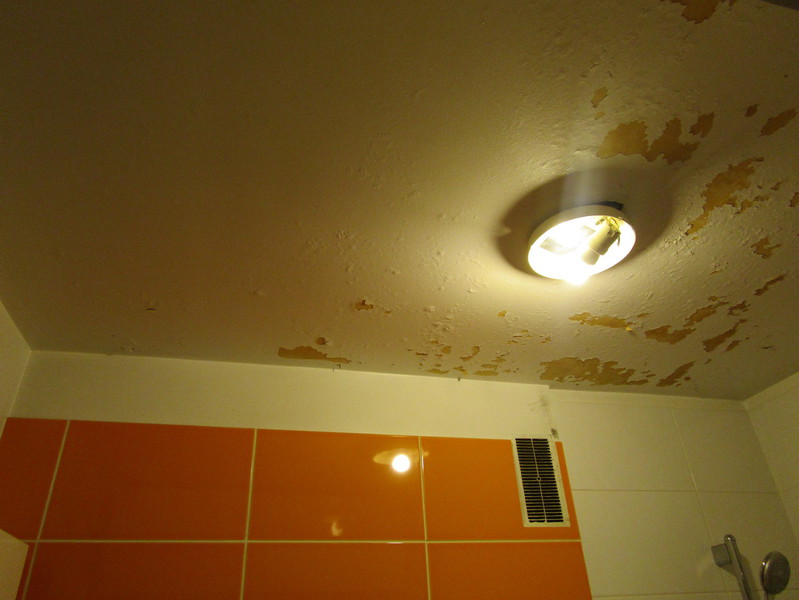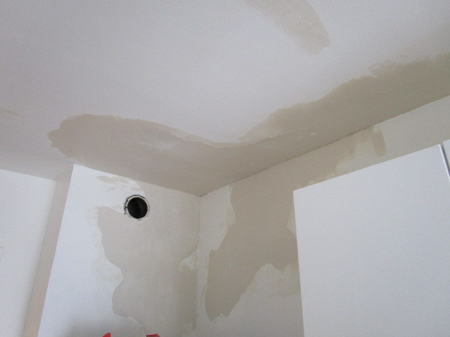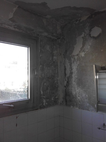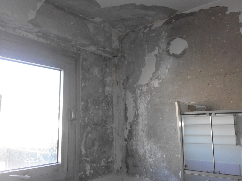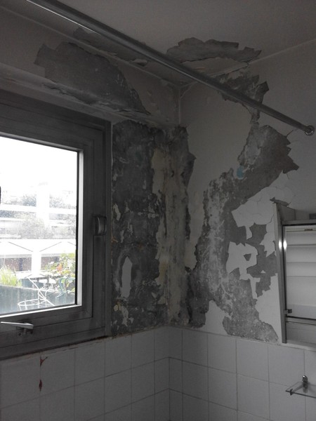 Rénovation d'une salle de bain après dégât des eaux (murs et plafond). Après réparation de l'origine de la fuite (défaut d'étanchéité d'un balcon à l'étage supérieur) et séchage naturel sur plusieurs mois :