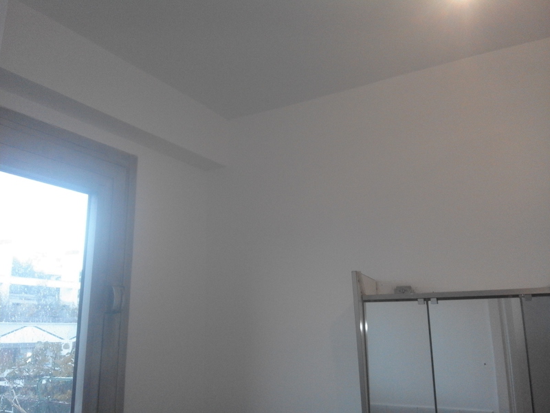 (ci-dessous) : travaux de peinture après dégât des eaux dans une salle de bain. Plafond et un mur atteints, les autres murs, la porte et le radiateur ont été repris en finition pour l'harmonisation des teintes. Travaux entrepris quatre mois après la réparation de la fuite dans l'appartement situé à l'étage supérieur.