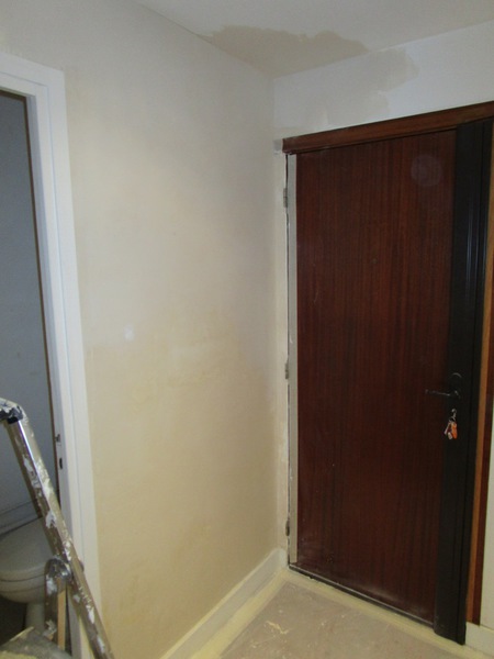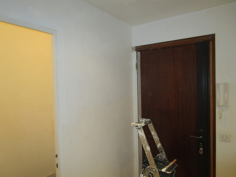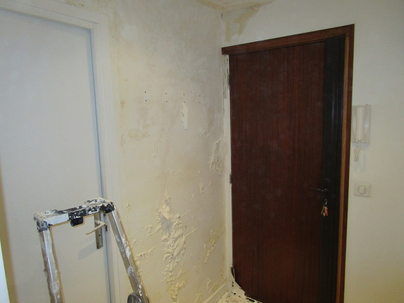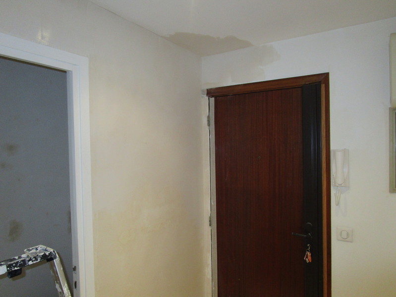 Travaux de peinture après dégât des eaux dans l'entrée d'un deux pièces. Paris 13ème. Deux murs et plafond atteints (les autres murs ont pu être repris en finition pour l'harmonisation des teintes. 6 interventions sur quatre jours.