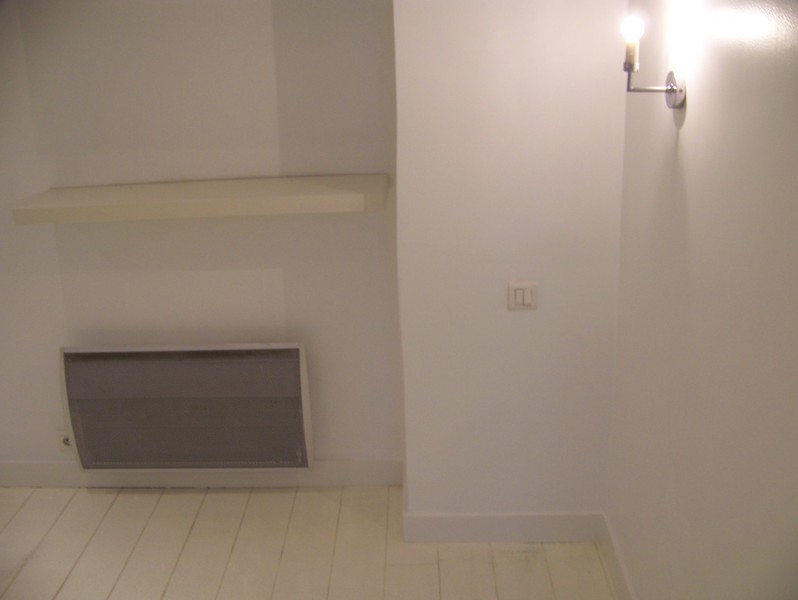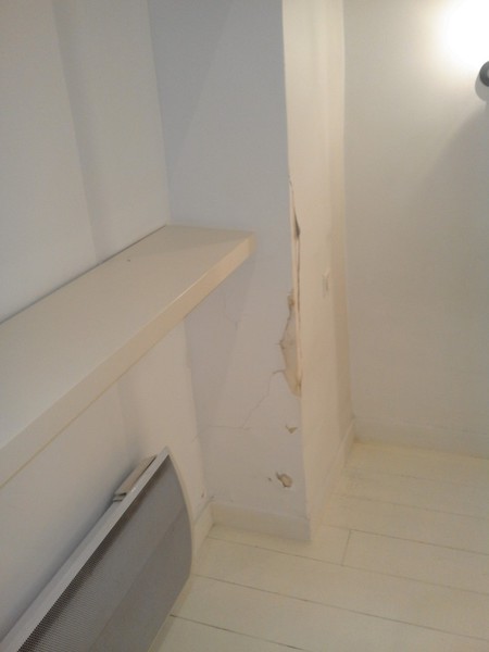 Peinture après dégât des eaux : conduit de cheminée dans une chambre (après réparation de l'origine de la fuite et séchage naturel sur plusieurs mois). Grattage, rebouchage, triple enduisage, application d'une sous-couche d'impression, deux couches de peinture acrylique satinée.