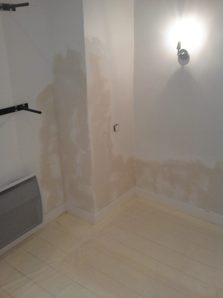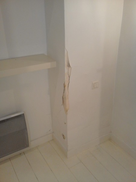 Rénovation (ci-dessous) d'une chambre suite à une infiltration depuis la façade de l'immeuble. Notre intervention a eu lieu plusieurs mois après la réparation, le temps que les supports sèchent entièrement.