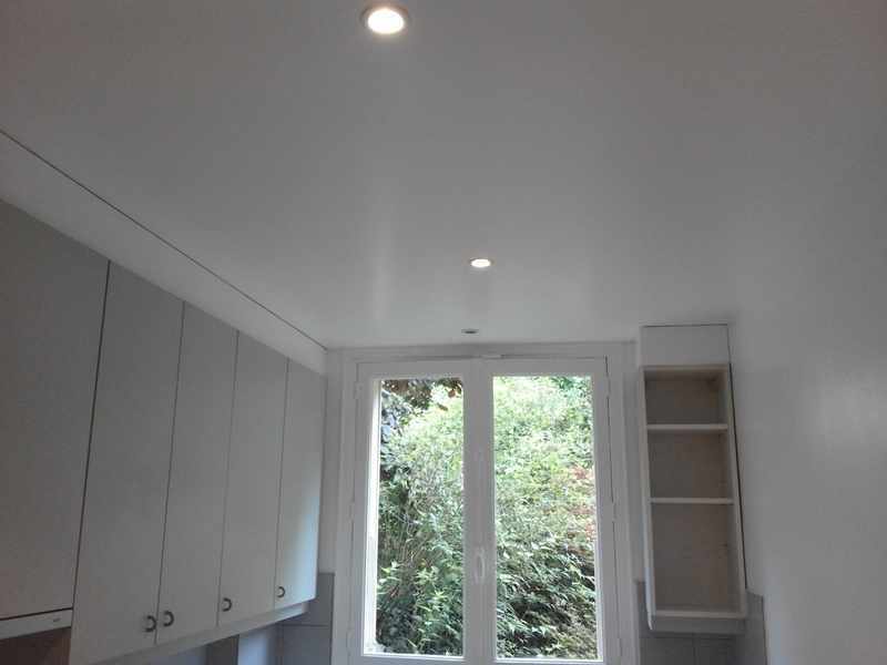 Ci-dessous : Rénovation d'un plafond (Salle de bain appartement Paris 13ème, Avenue des Gobelins. Chantier habité par les locataires pendant les travaux. 4 interventions d'environ deux heures sur 4 jours.