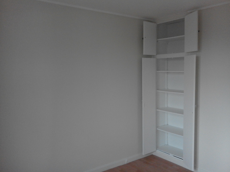 Ci-dessous : travaux de peinture d'une cuisine (lessivage, rebouchages, traitement des fissures, enduisages partiels, sous-couche impression, deux couches de peinture acrylique satinée blanc cassé.